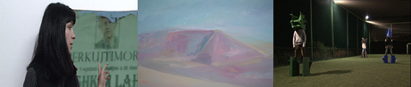 In Sidi Kananis paintings we can see stylized reproductions of different abandoned buildings. The atmosphere in the paintings is ghostlike and has a strong presence of the history related to each place. It is like if the buildings would want to tell us a story: about the past and what once took place here. In the exhibition why does gravity make things fall wecan see four paintings of the pyramida in the centre of Tirana. Like in Sidis previous works this building stands alone asking us for attention and refering to the title of the work: as if it would be calling for identity.