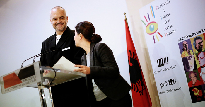 Albanian Prime Minister, Mr,Edi Rama, giving the prize certificate to T.I.C.A-program coordinator Alketa Kurrizo