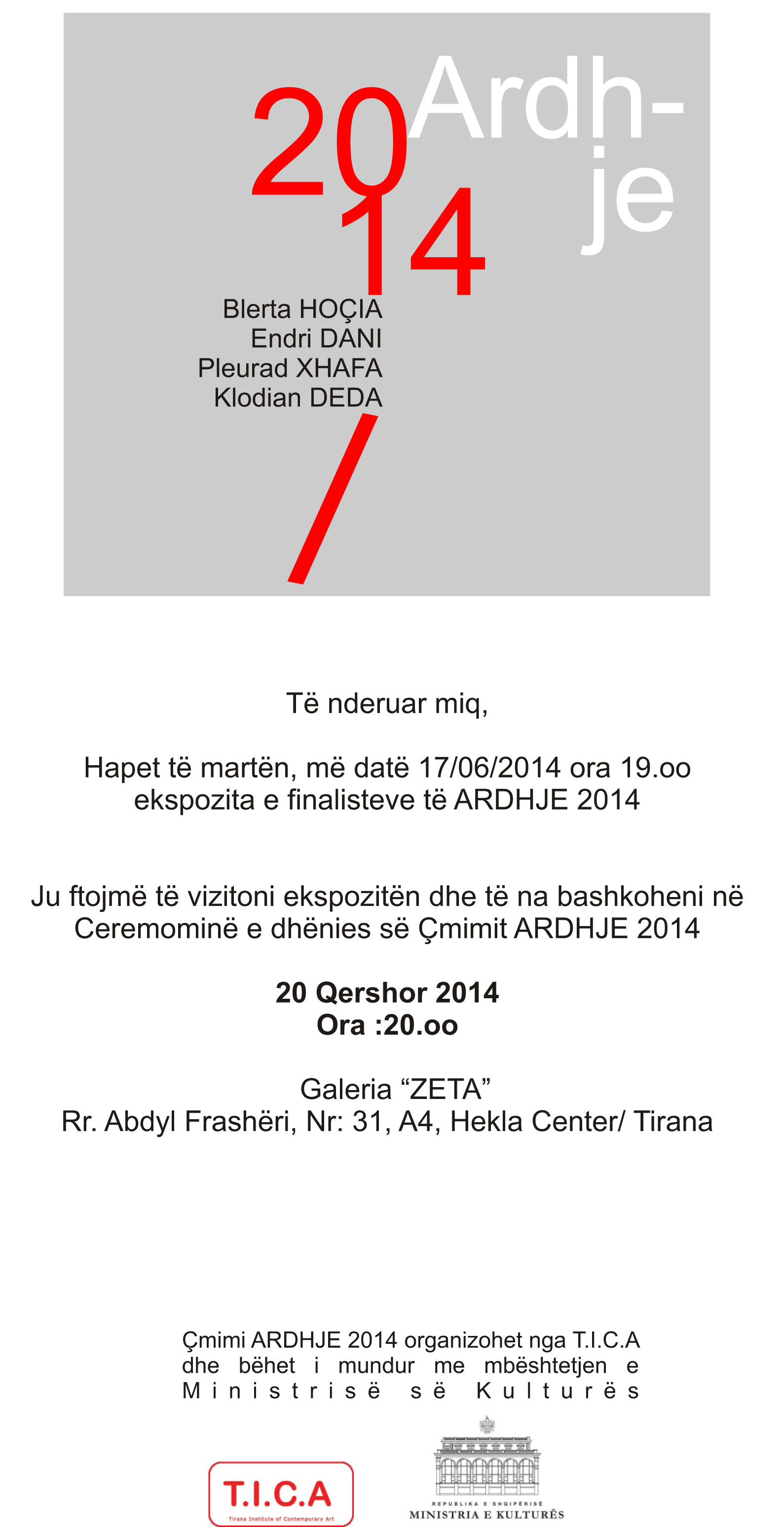 T.I.C.A –Tirana Institute of Contemporary Art, ka kënaqësinë të shpallë listën e artistëve të cilët do të konkurojnë për çmimin ARDHJE 2014: